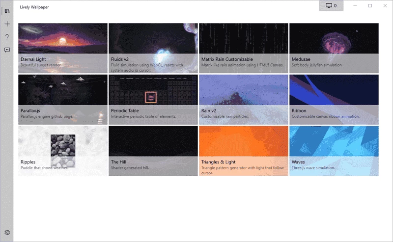 Lively Wallpaper fue desarrollado por Rockdanister para convertir GIF, videos y juegos en fondos de pantalla animados. La configuración multimonitor ofrece compatibilidad total con configuraciones y resoluciones de todo tipo de monitores. Funciona de forma fiable sin interferir con tus actividades, ya que se pausa automáticamente al iniciar cualquier aplicación de pantalla completa, como un videojuego. Descarga la aplicación y convierte videos, GIF, emuladores, NTML, direcciones web, shaders y juegos en fondos de pantalla animados para tu escritorio.